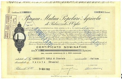 certificato nominativo cumulativo di 2 azioni da 500 Lire ciascuna. Palazzolo S./O. BS 1 gennaio 1952. Officina Carte Valori Turati Lombardi e C. di Milano. 33,5x22 cm.