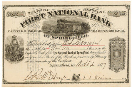 titolo nominativo cumulativo di 10 azioni da 100 $ ciascuna. Springfield / Kentucky 1877. Stampato dalla Maverick Stephan & Co. a New York. 24,5x16 cm.