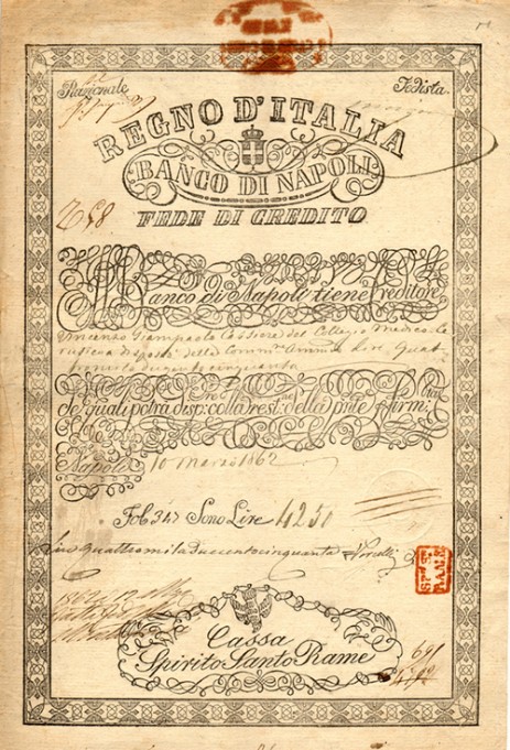 Madrefede di credito di Lire 4.250. Napoli 10 Marzo 1862.