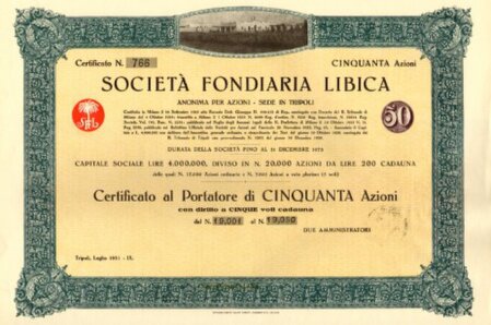 certificato al portatore di 50 azioni da 200 Lire con diritto a 5 voti ciascuna. Tripoli luglio 1931 - IX. Officina Carte Valori Turati Lombardi e C. di Milano. 36,5x27 cm.