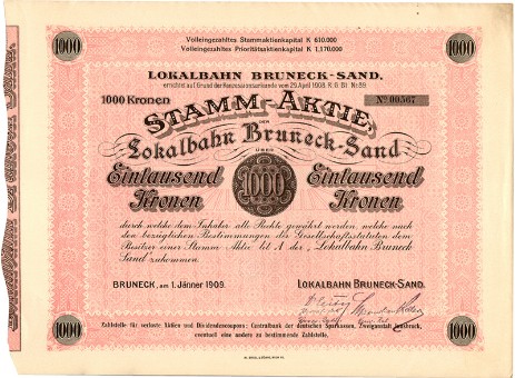 comune di fondazione al portatore da 1.000 Corone, tipo A. Brunico BZ 1 gennaio
